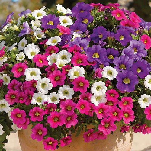 Petunia Trillion Bells Celebration Mix has a good all-weather tolerance, great resistance to diseases and pests, plus with its improved vigour and branching habit you can be guaranteed superior flower power with no deadheading required.